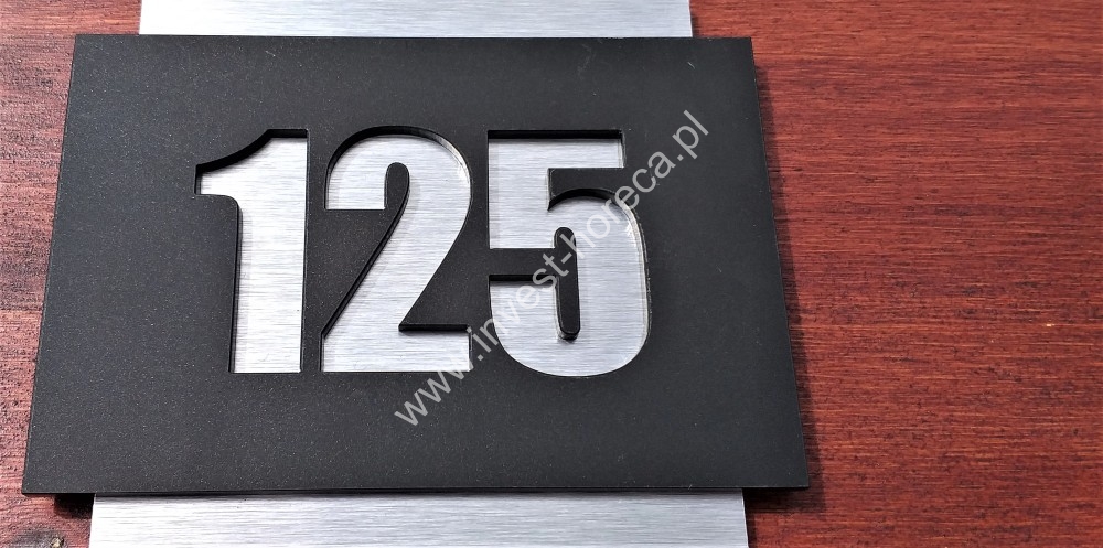 Aluminium szczotkowane w kolorze srebrnym lub złotym - łączone z acrylem w kolorze czarnym błysk. Grafika wycinana na wylot. Mocowanie na taśmę samoprzylepną dwustronną 3M. Wymiar Numerka 10 x 10cm. Proszę wybrać rodzaj z tabeli poniżej.